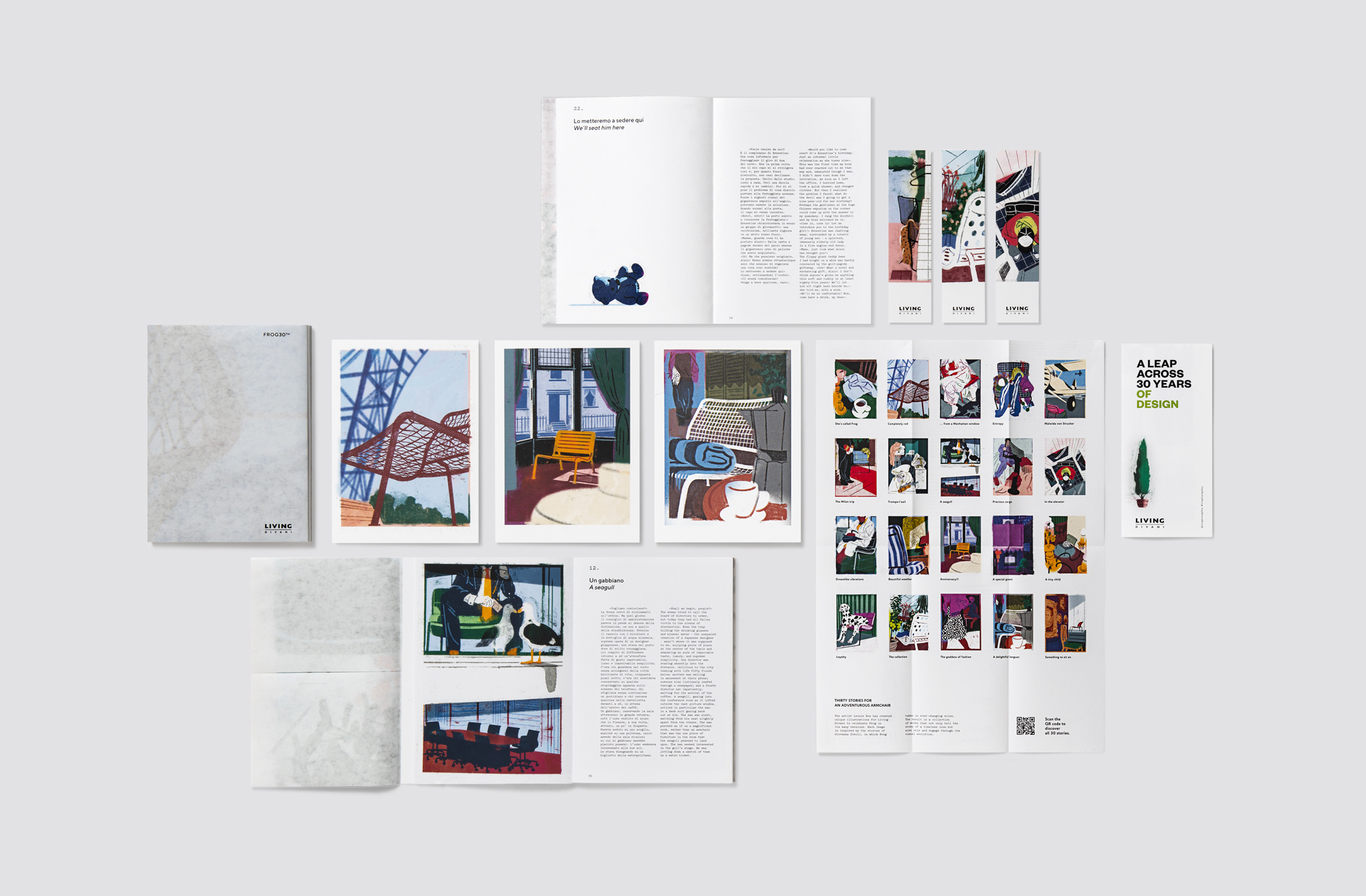 Concept development, art direction and graphic design for Living Divani’s book and a series of coordinated printed materials — poster, postcards, bookmarks and tote bag — on the occasion of the 30th anniversary of the Frog chair.