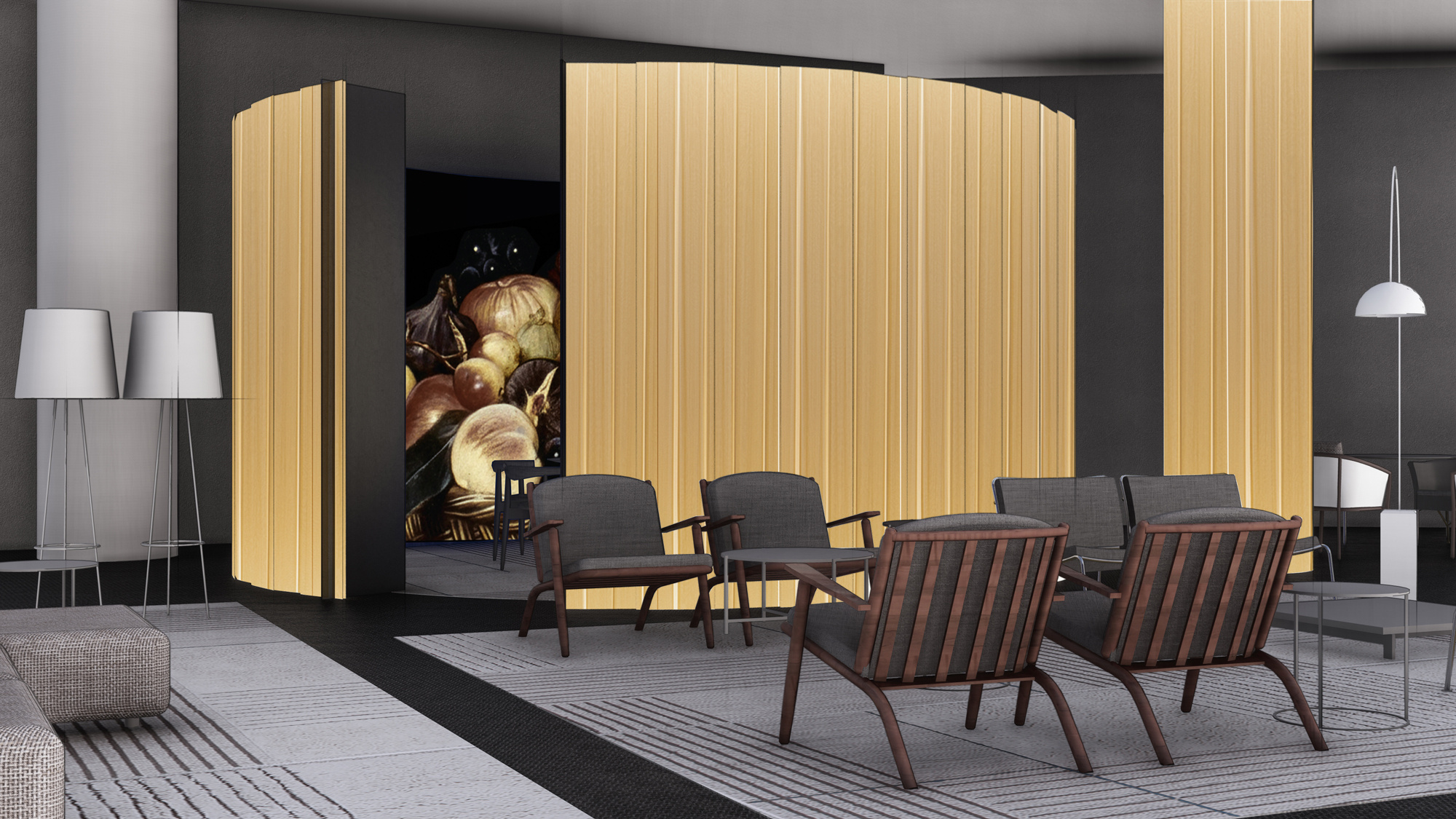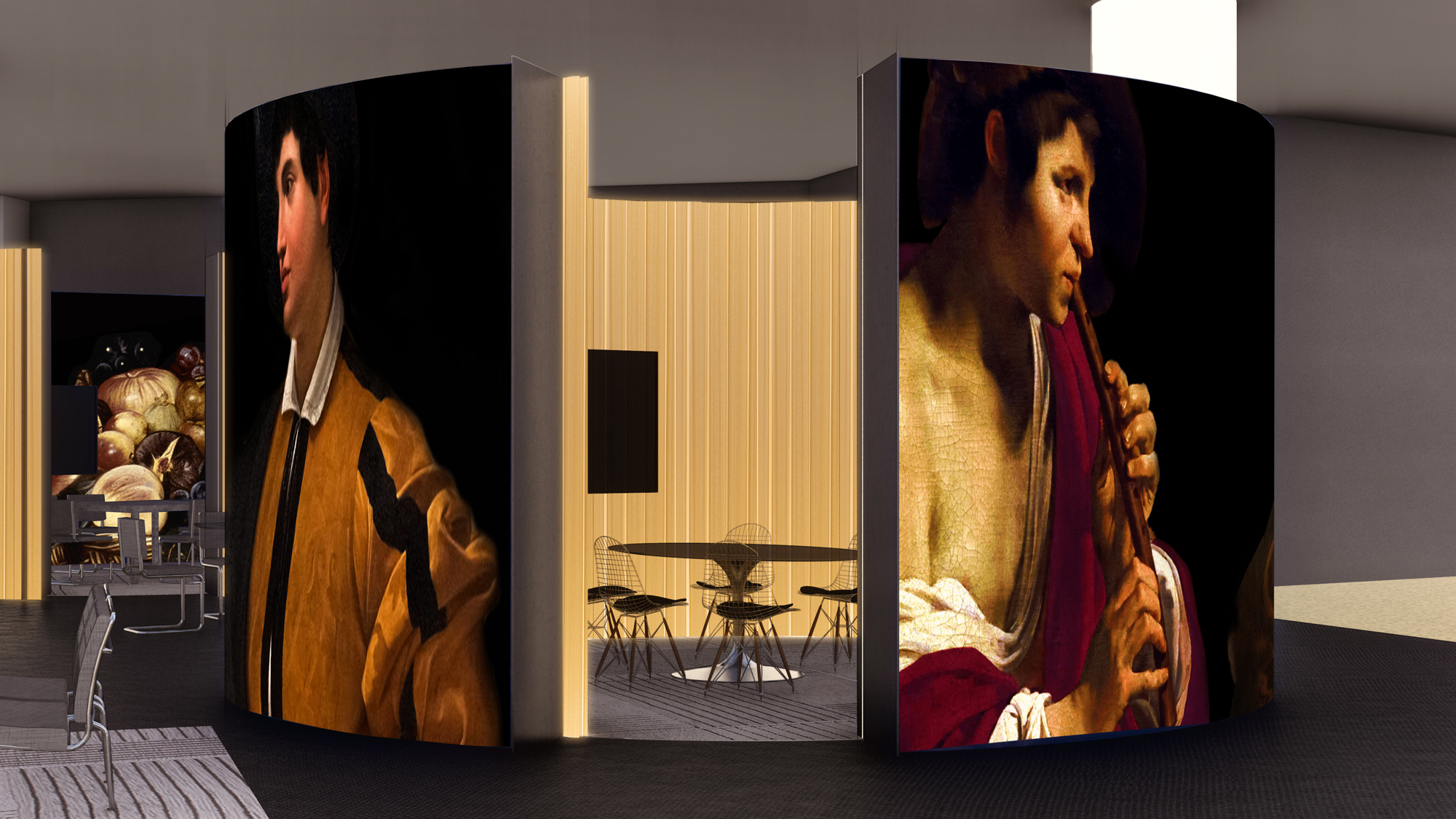 Five more intimate rooms, delineated by curved walls that appear as large room dividers, offer relaxed, private areas. The circular volumes present an alternation between inside and outside through pleated, backlit upholstery and decorative graphics inspired by classical Italian paintings, generating a multifaceted landscape.