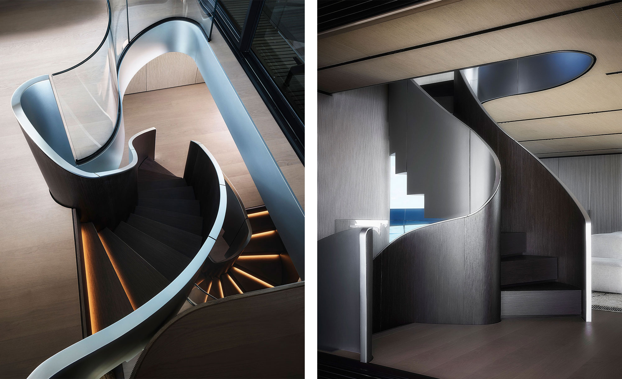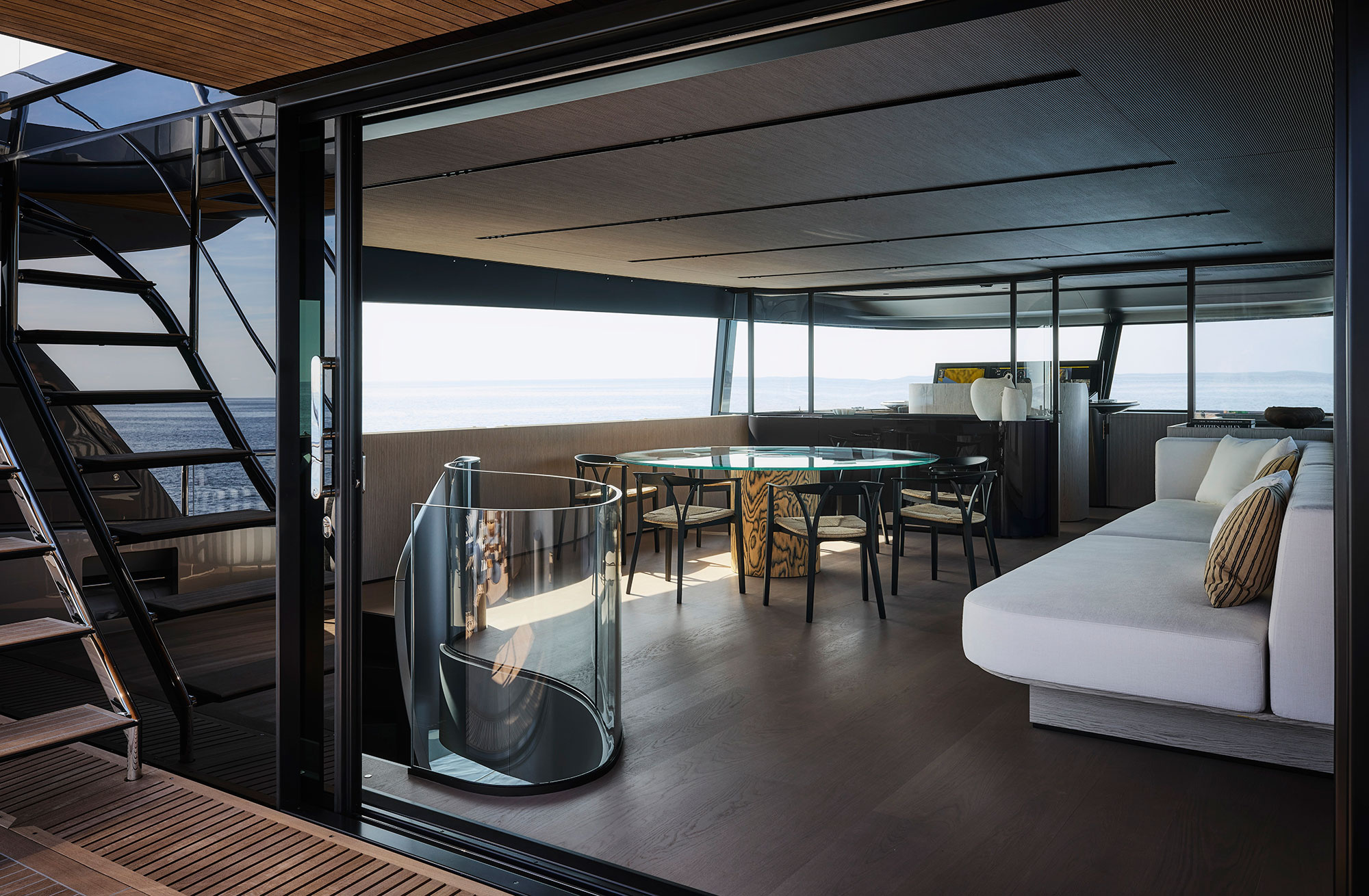 The SX family expands further with the SX120, broadening the range with a series of designs that draw from the idea of opening up the aft section with a large cockpit and so shifting the volumes forward towards the bow. The boat extends over four decks connected by a central staircase: a sculptural and distinctive element clad externally in a metal-like film and internally in wood.