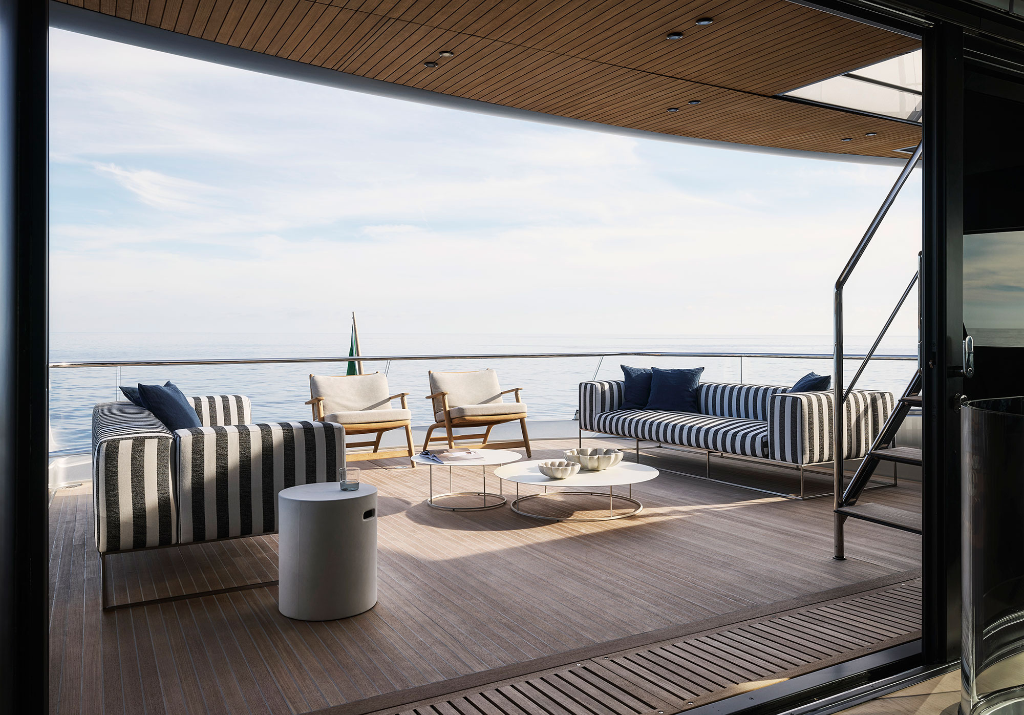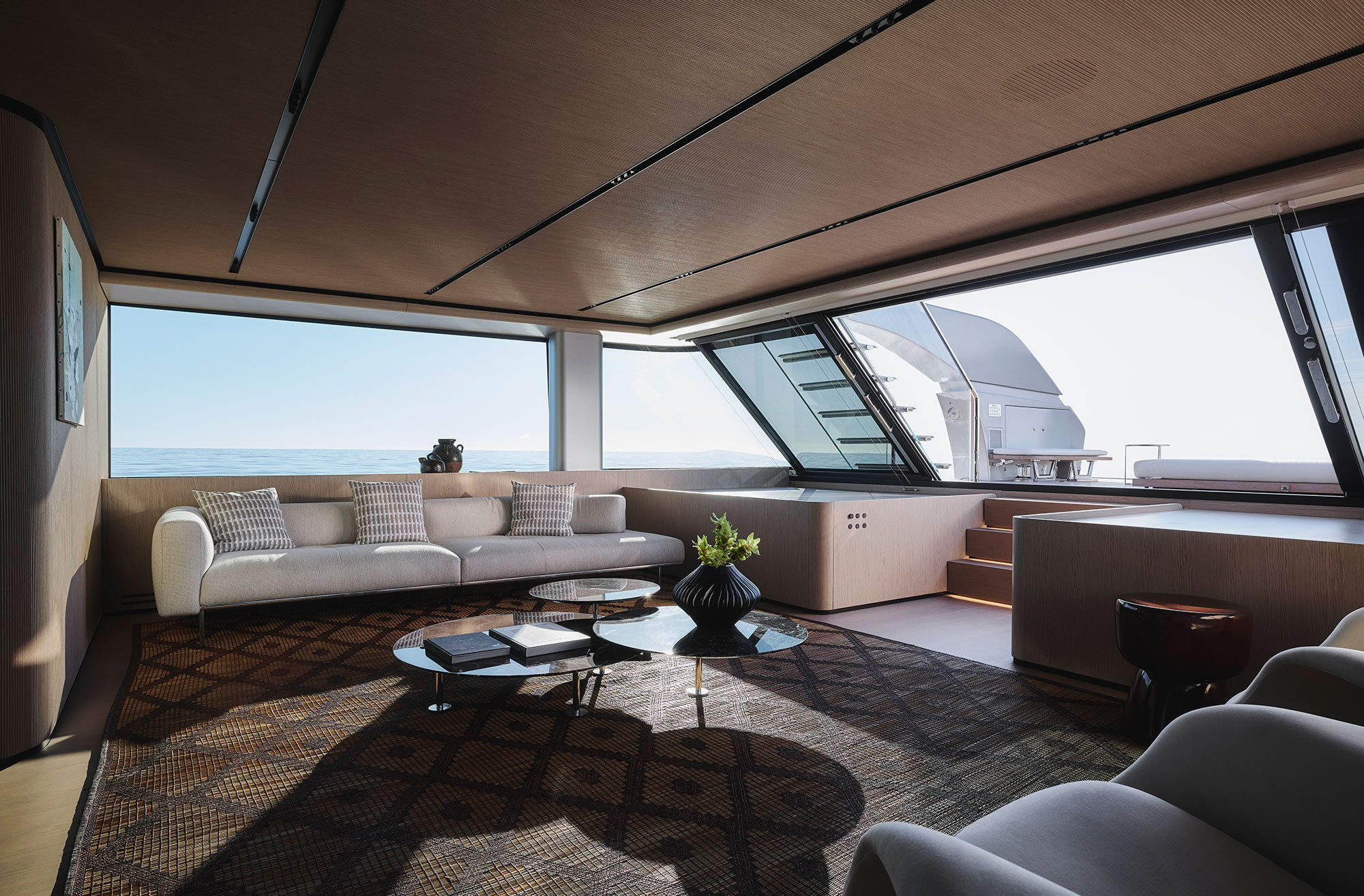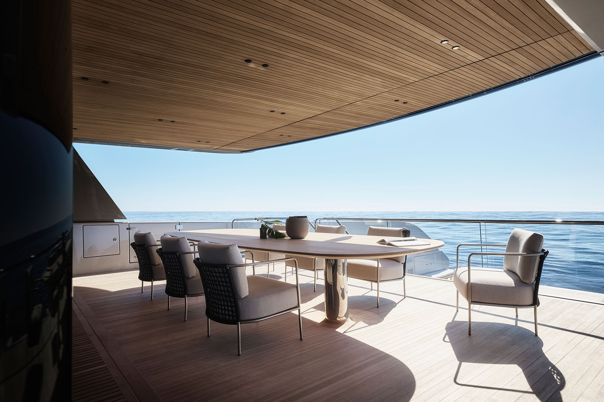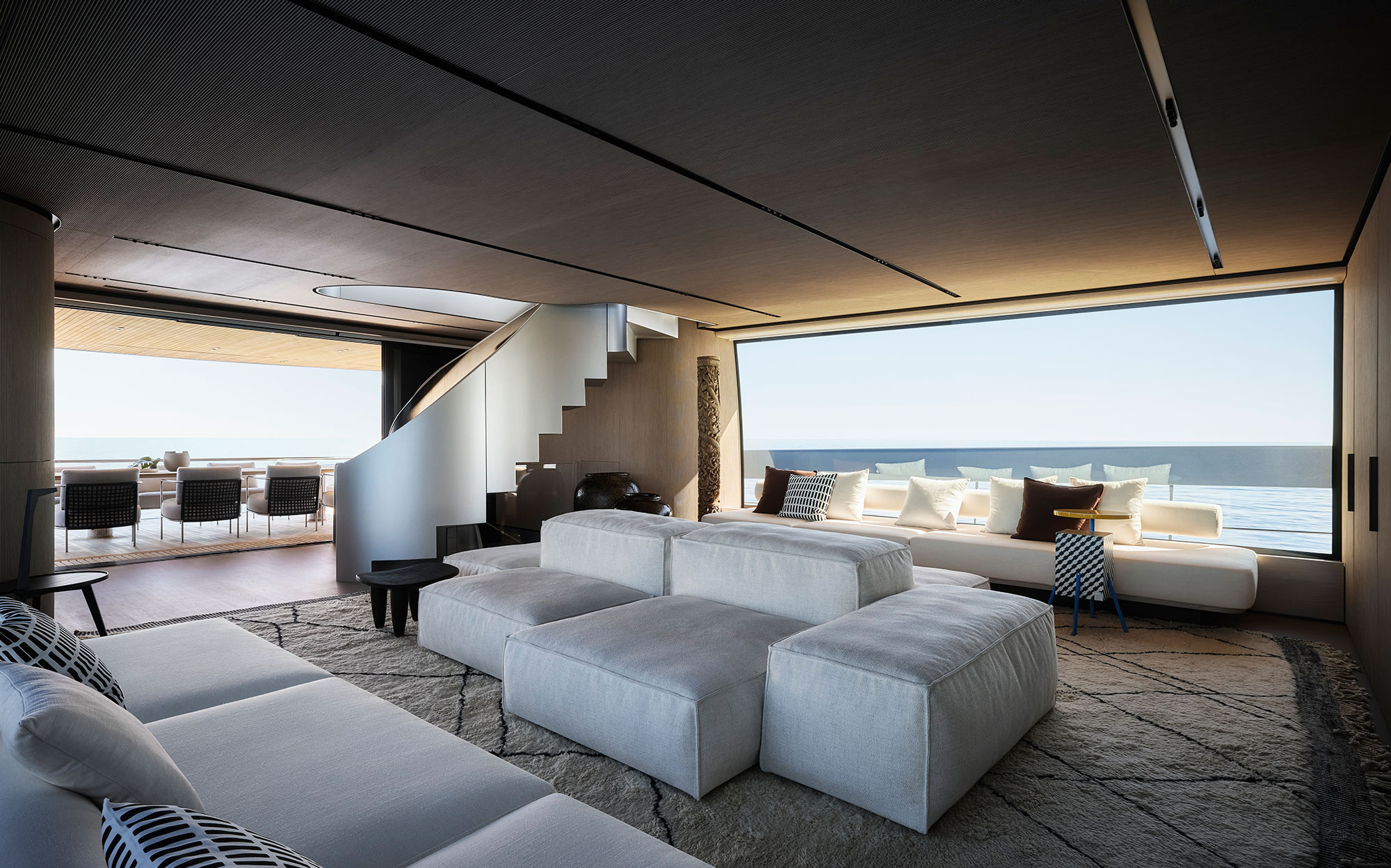 In addition to the wheelhouse, the upper deck also features a dining area with a large sofa as well as the sundeck, accessible via an external staircase, where the Smart Island has been created: a new system of fully modular seating that will become standard for Sanlorenzo vessels.