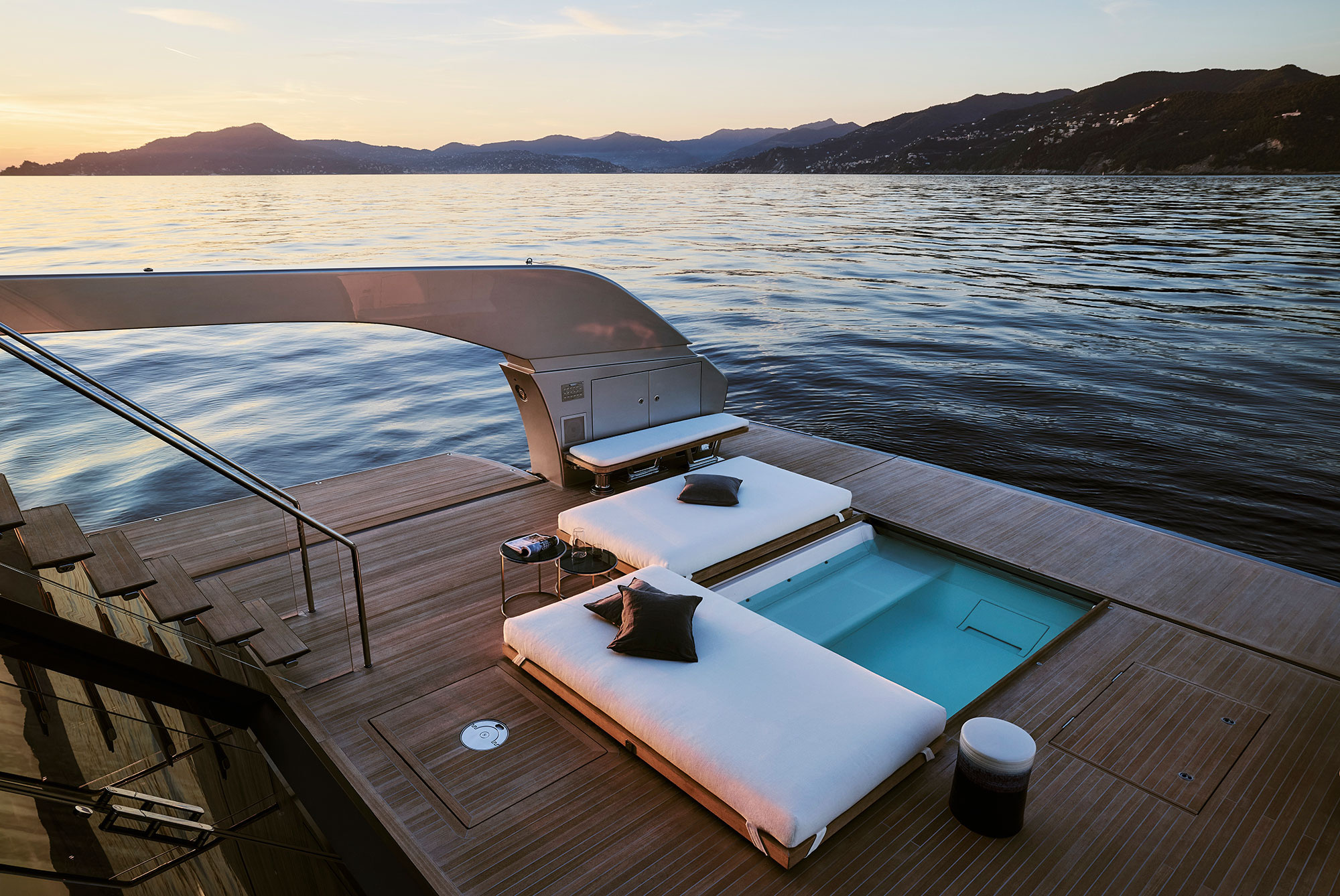 The large, 40 sqm beach area on the lower deck connects with a spacious interior lounge. On the same deck are four cabins, one of which can be transformed into another lounge when required, a hammam and an area for the crew.