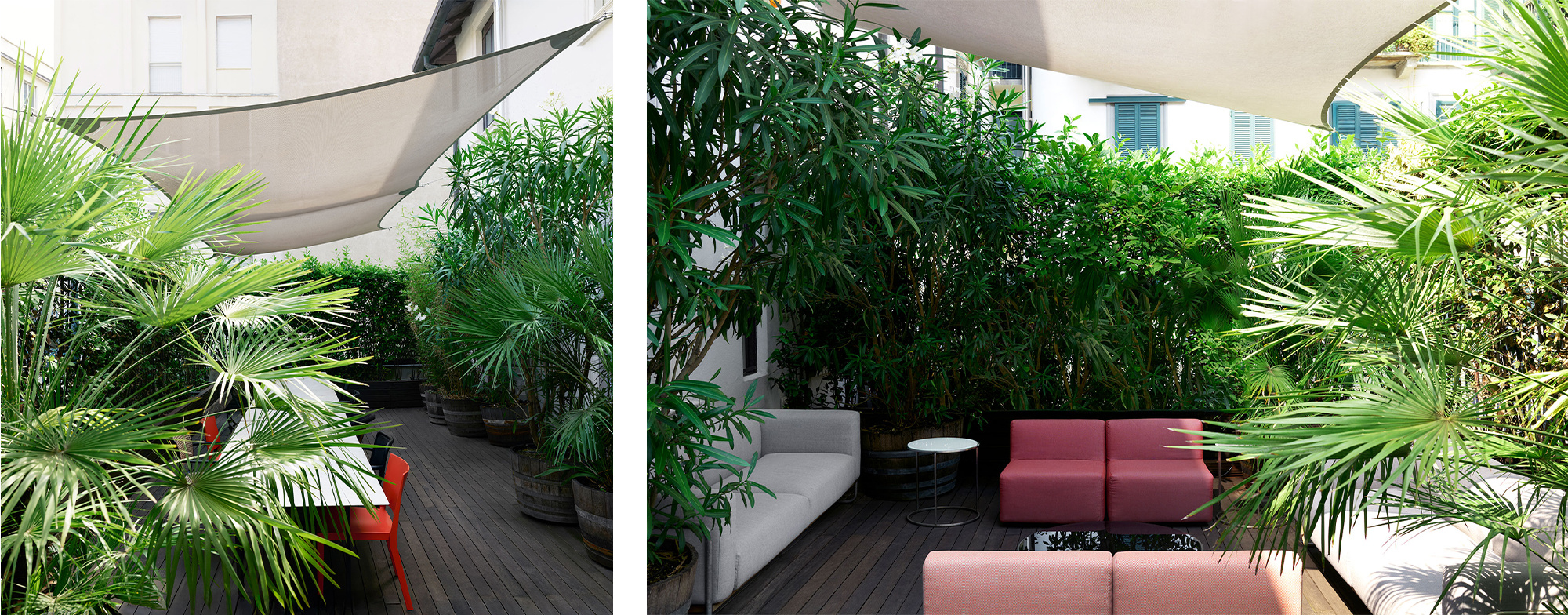 Both offices share the same aesthetic and design philosophy: a predominance of white with luminous and minimal spaces that are functionally furnished, the whole framed by large windows, internal courtyards, terraces and green spaces.