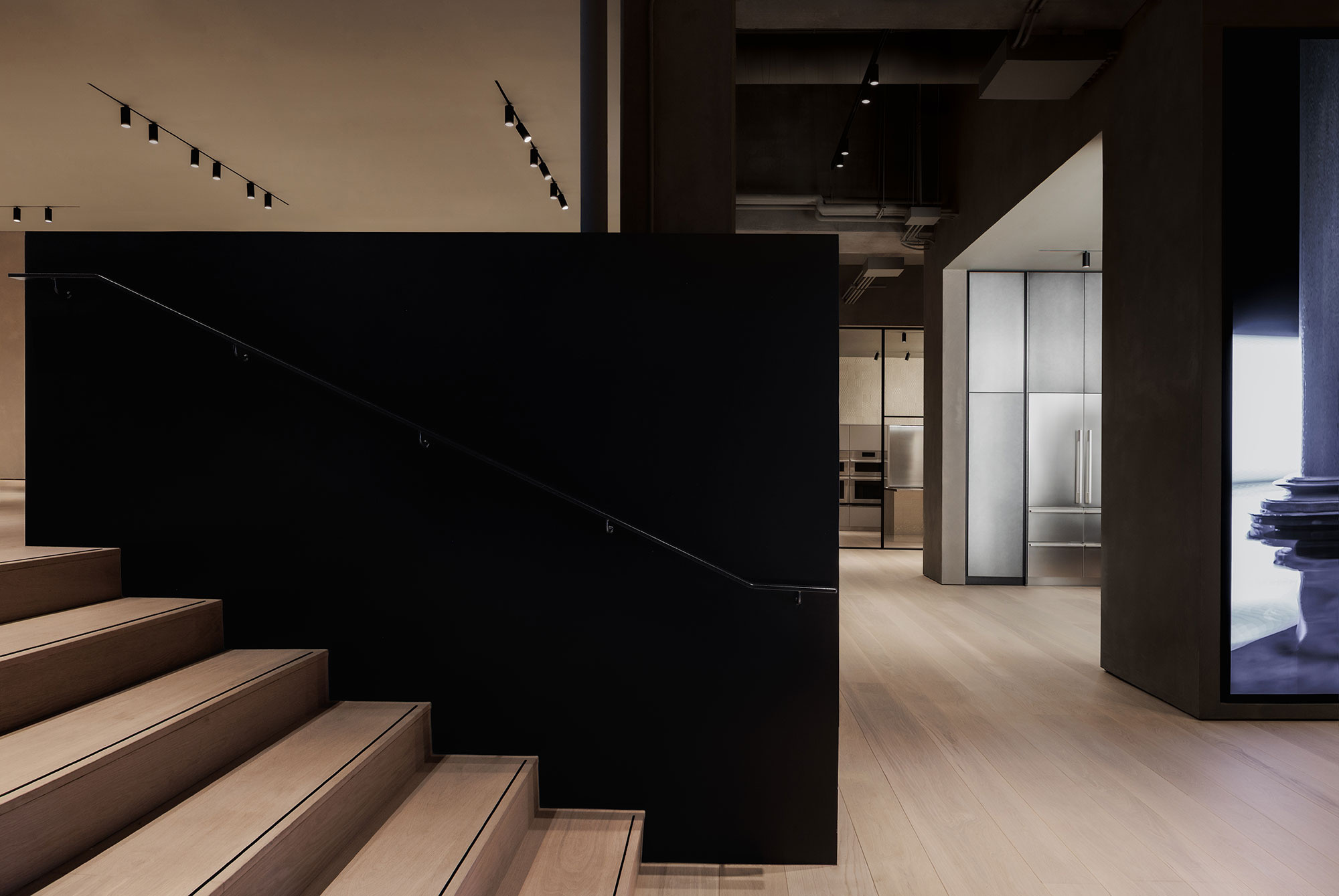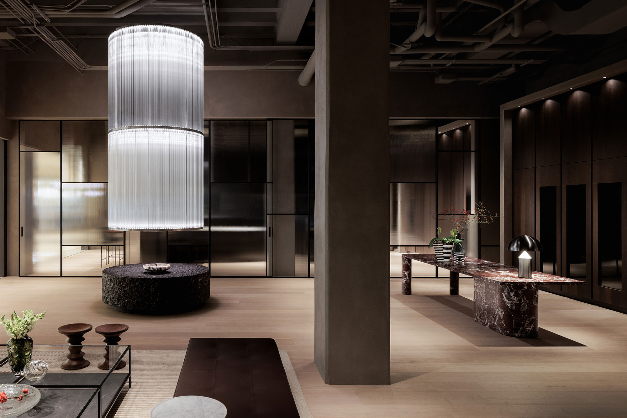 The products take center stage against a backdrop of neutral materials. Refined white oak flooring unifies the entire space, while the walls and columns are hand-troweled with an earthy shade of roman plaster, revealing the imperfections of the pre-existing architecture. Almost all the ceilings were left exposed in order to reinforce the relationship between the modern interiors and the rich history of the site.