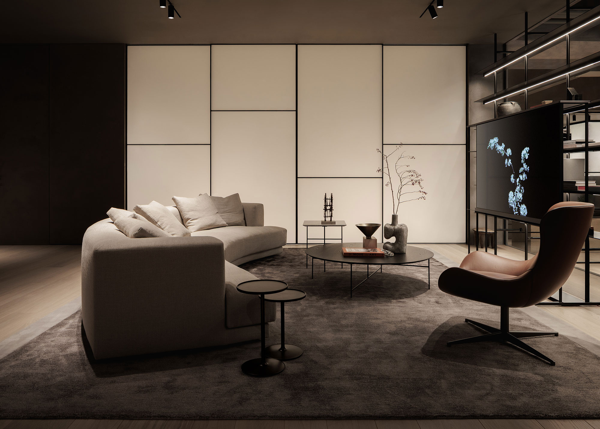 “For me, the spaces where design pieces are presented are like theaters where the product takes the leading role, an actor moving through the set. When I began to think of an architecture for the SKS showroom, I imagined it as a stage where the scenery periodically shifts and the products have the capacity to change roles. The beauty of this project lies in the fact that every SKS product can take centerstage, and each space is a story that can be illuminated. On the one hand we show the role that each product plays within its own particular setting, and on the other we tell the story of the extremely sophisticated, wide-ranging and distinct collection of an international brand leader.” Piero Lissoni