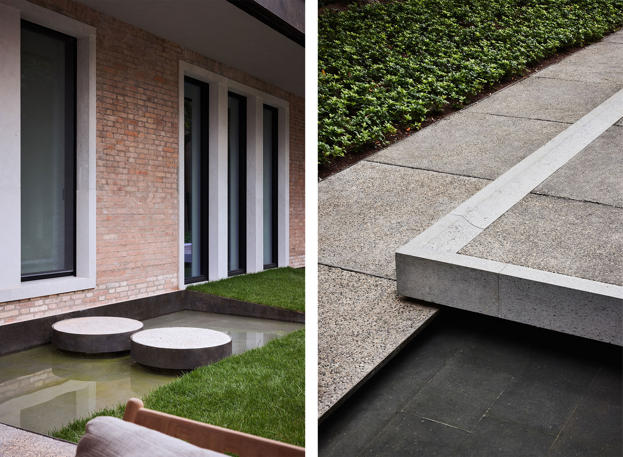 The garden spaces are defined by watercourses, large concrete basins and planted decks.