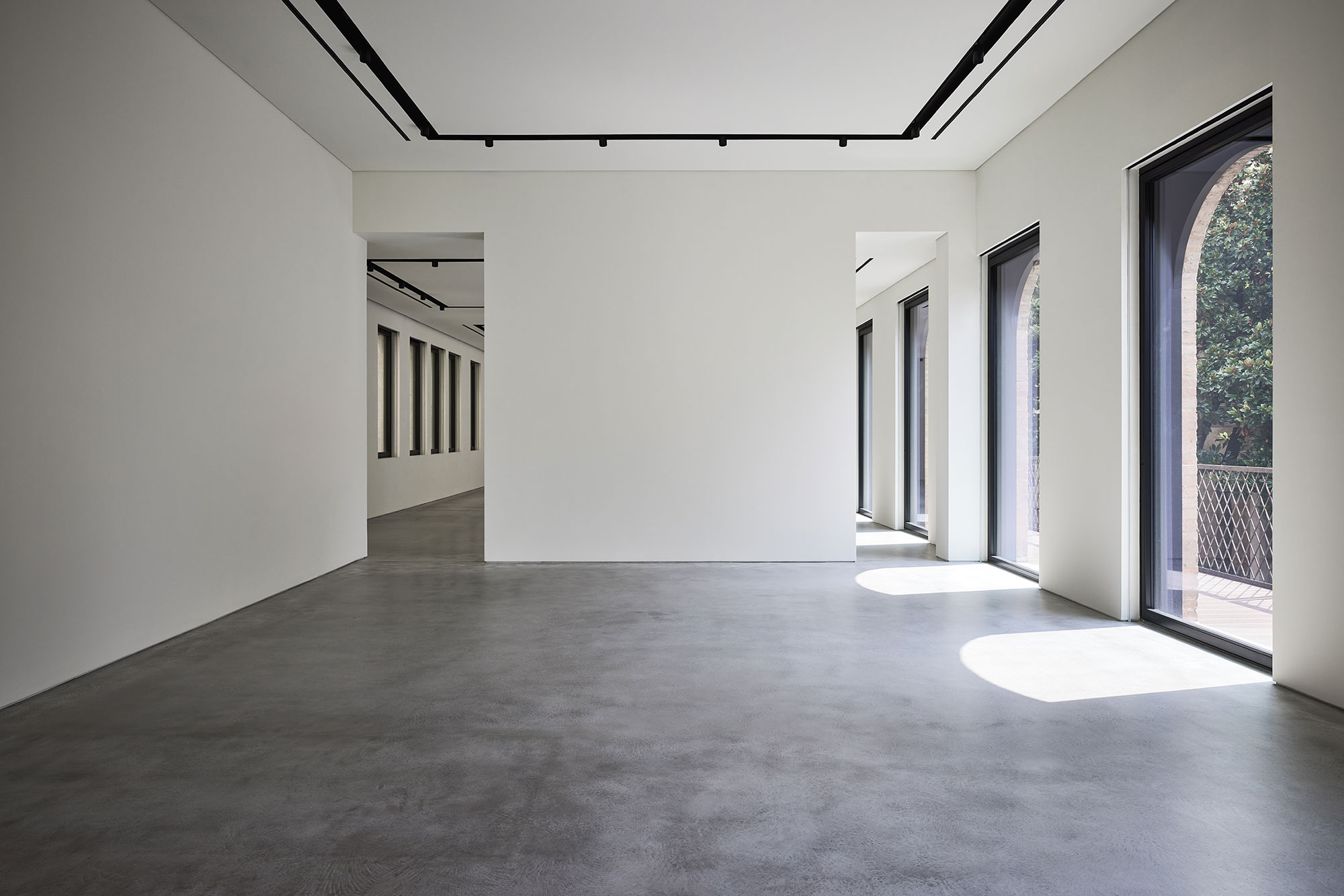 The area of over 500 square meters was emptied and pared down to the essence in order to give it a new identity as a museum: a flexible white box that can be modified according to need, with windows that overlook the Basilica dei Frati on the one side and the garden on the other, in continuous dialogue with the building. The Casa also borders a small canal on another side.