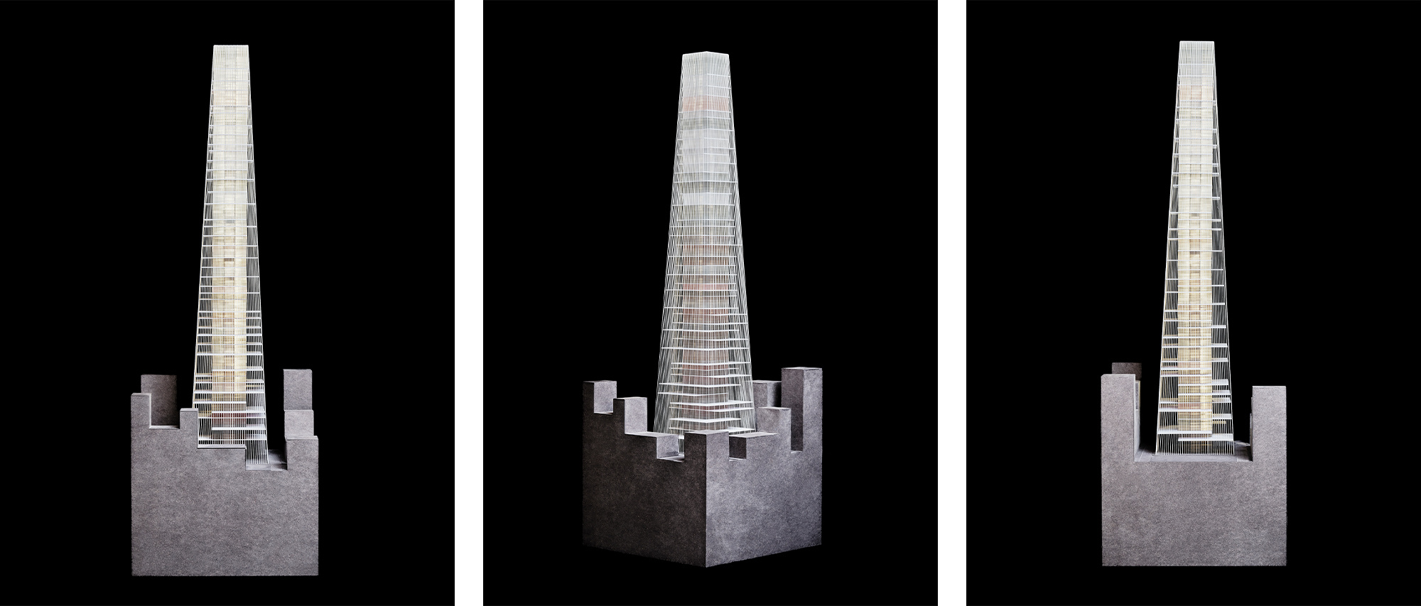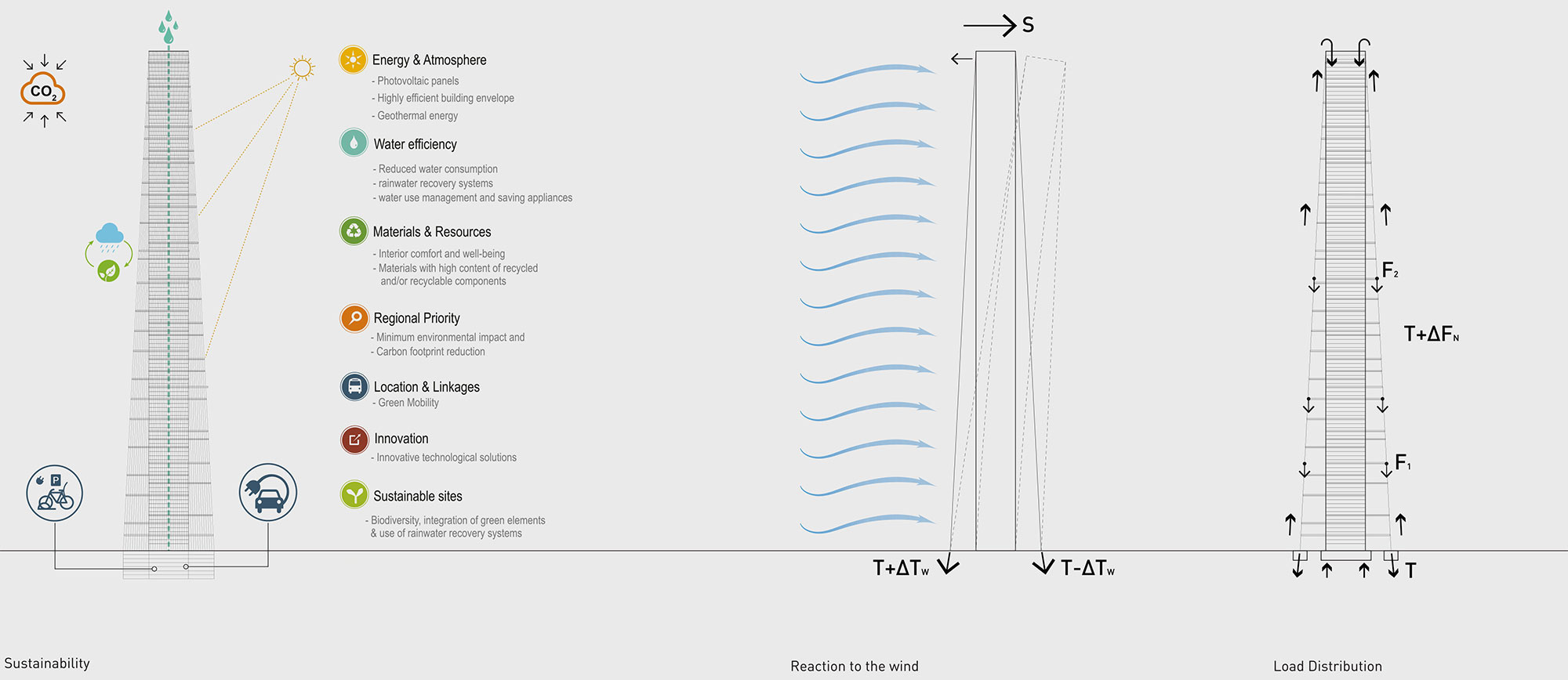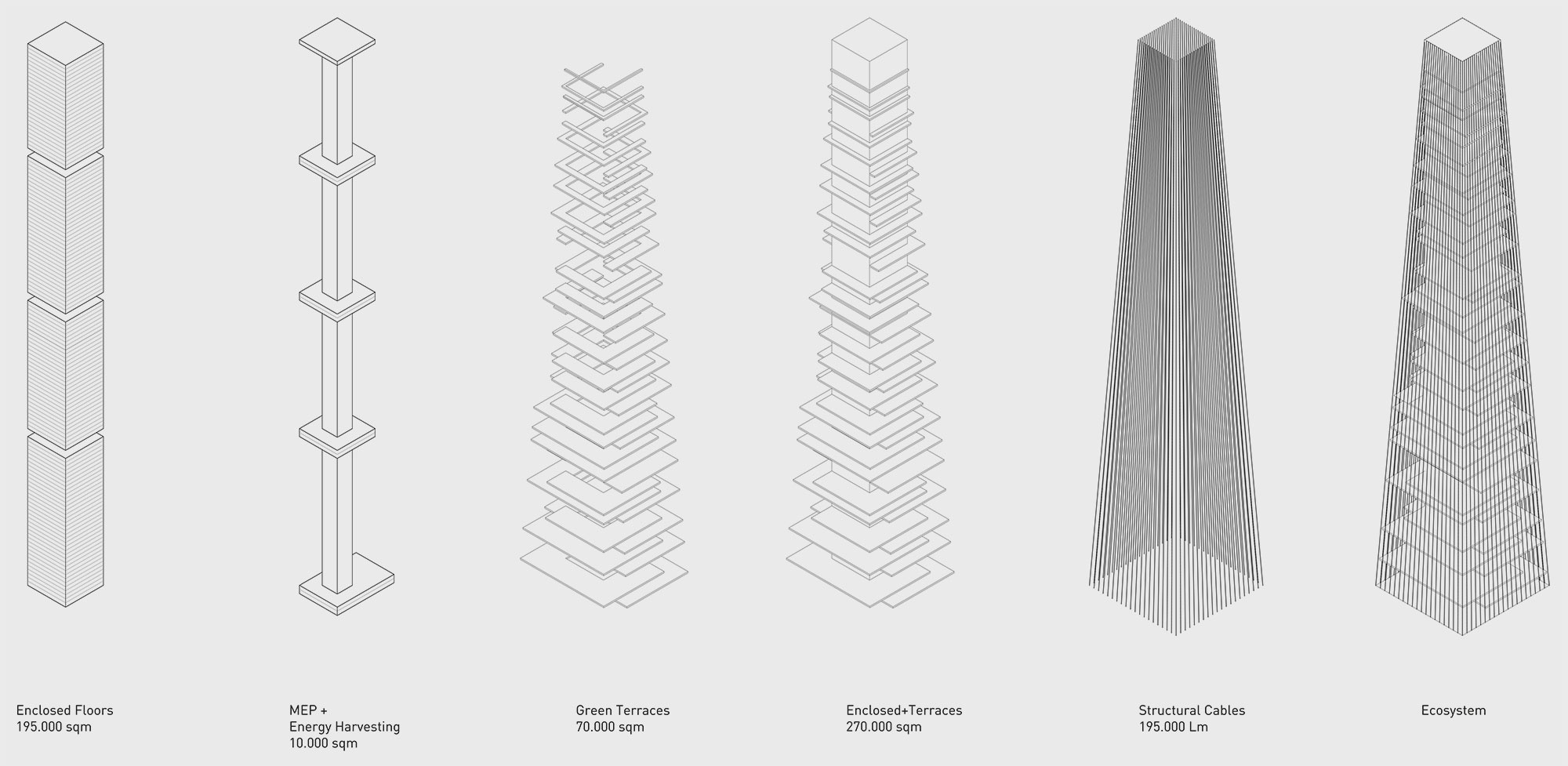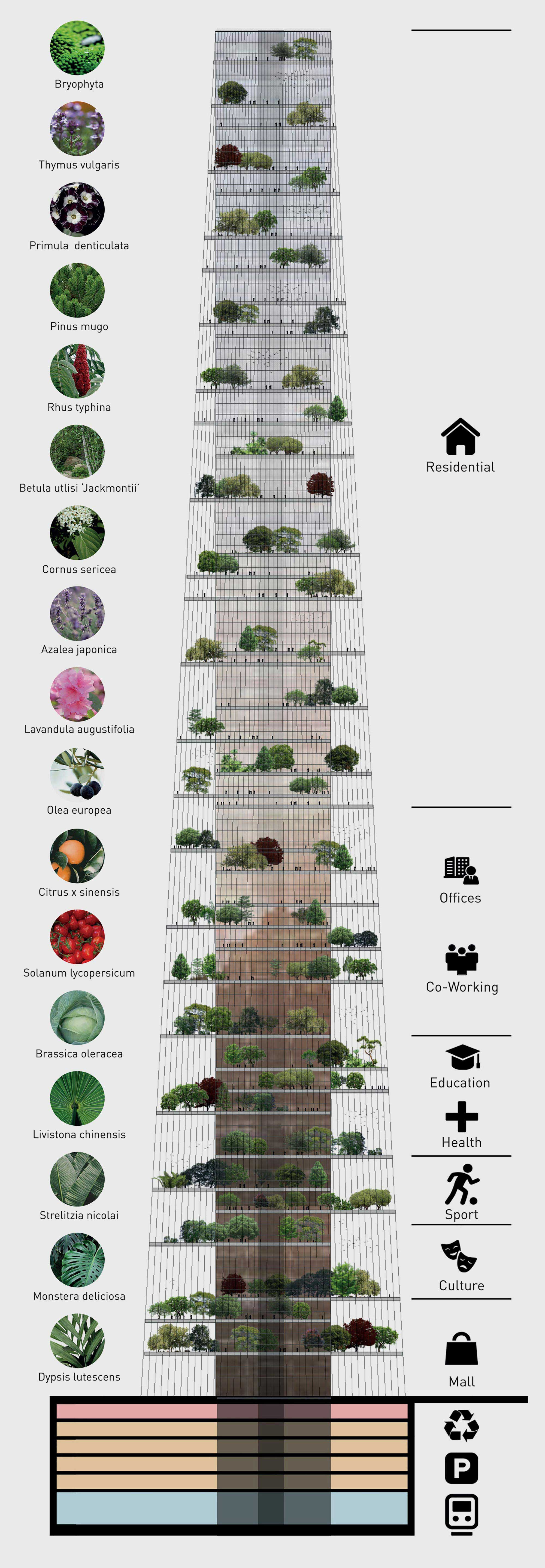 Starting from an urban lot measuring 80m x 130m, the skyscraper develops from the central nucleus that houses the primary functions and which is surrounded by large hanging gardens supported by an external curtain of steel cables that have both a structural and an aesthetic function. The equilibrium between the external and internal spaces gives life to a sort of self-sufficient garden-city.