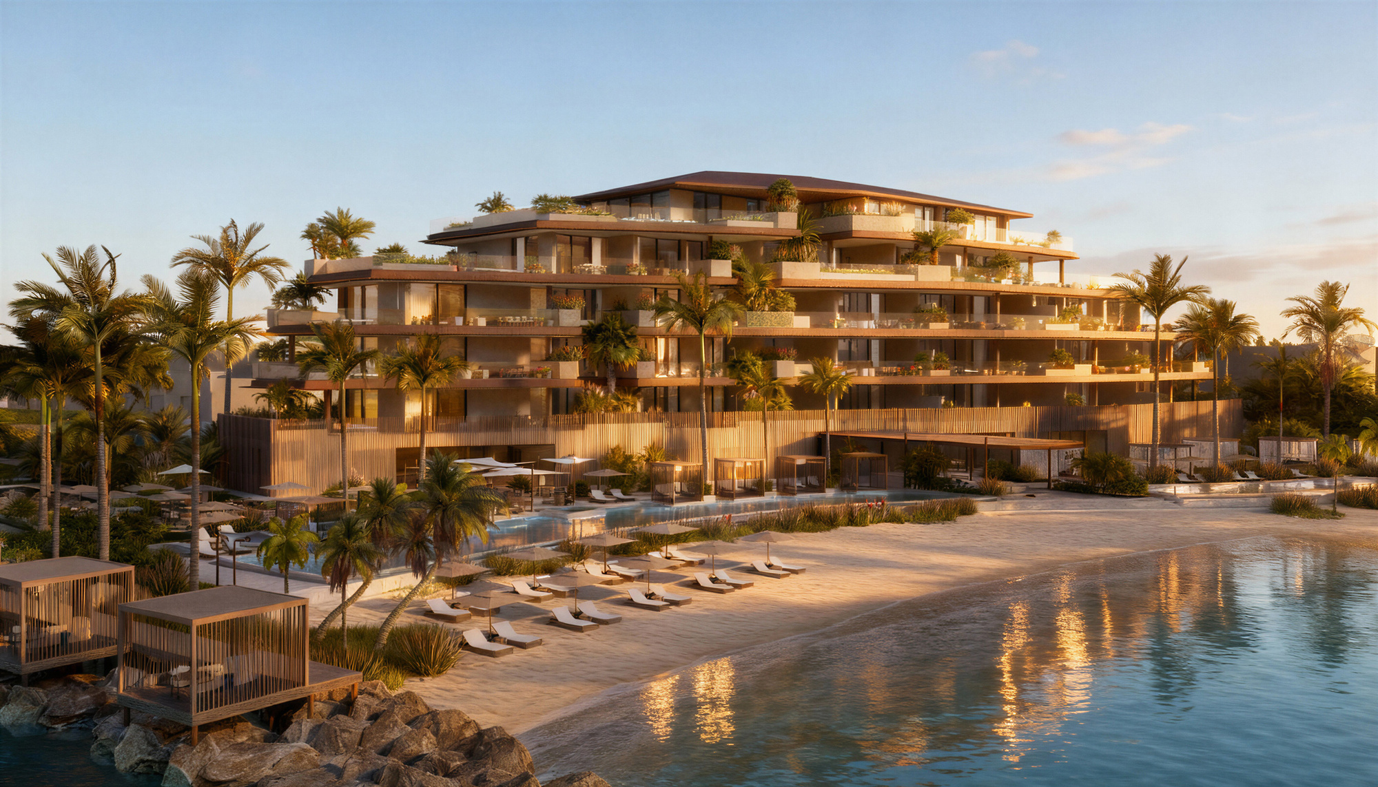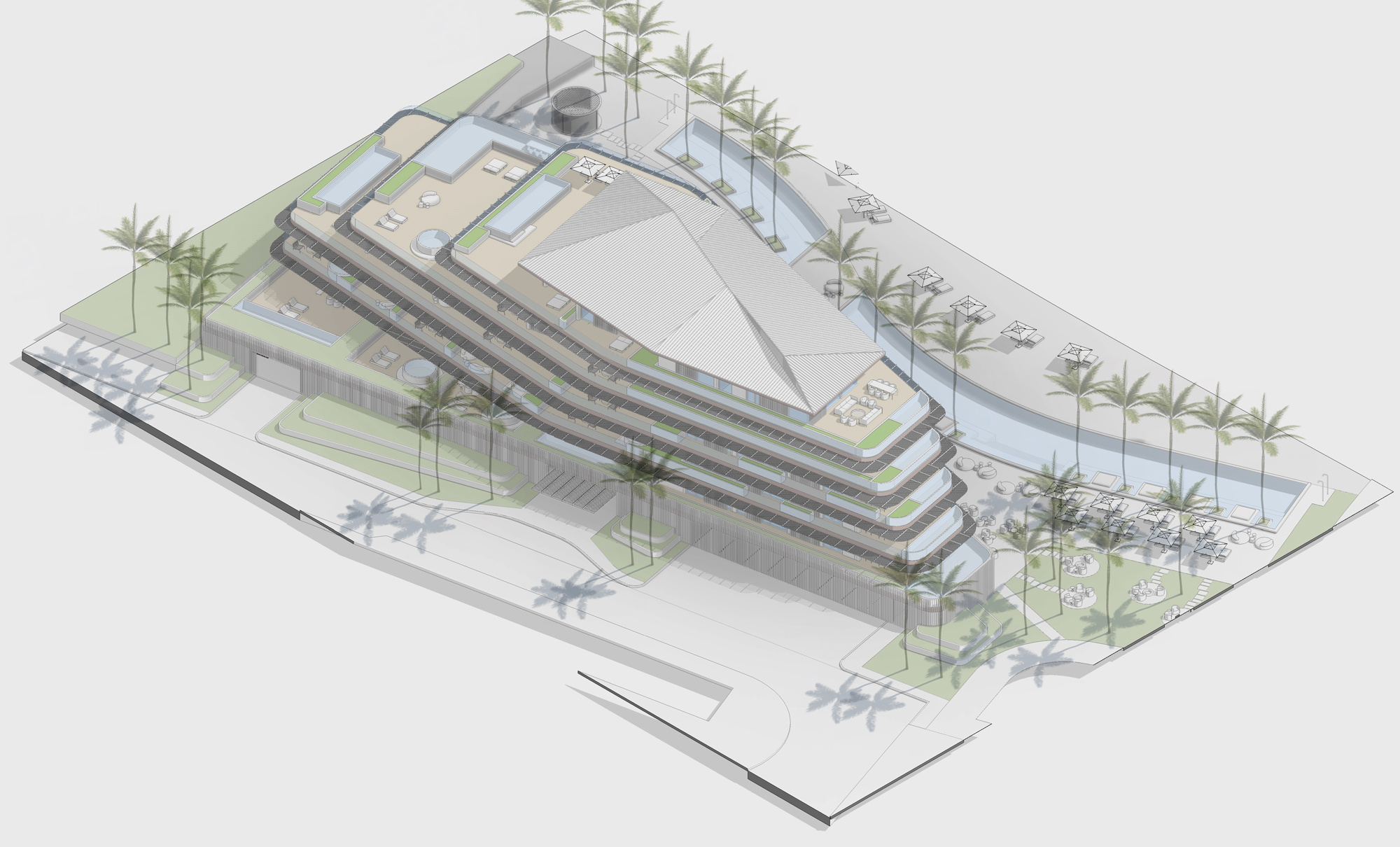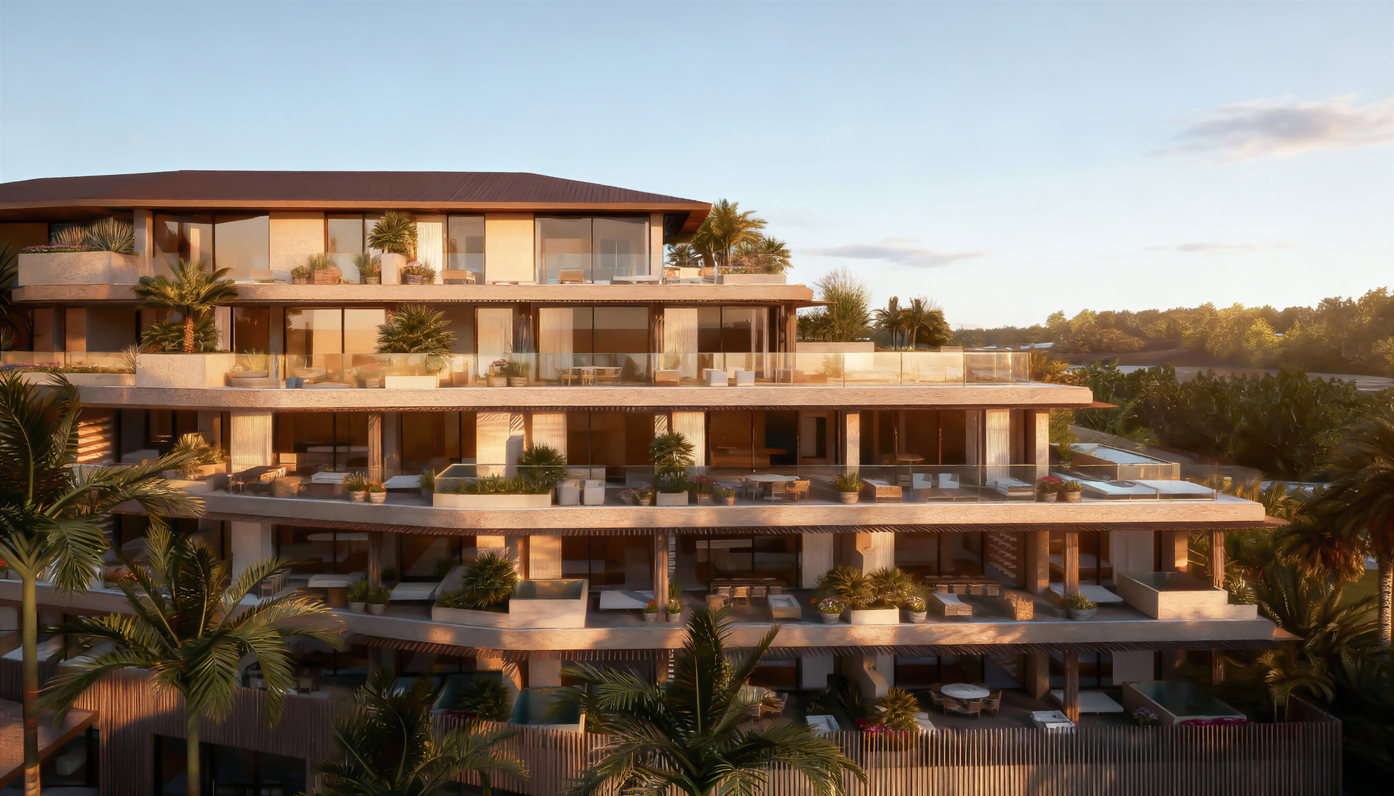 The design of ARC South Bank draws inspiration from the surrounding archipelago and the natural elements traditionally used in Turks and Caicos architecture. Arc's cascading, stepped forms create large overhangs that offer shaded outdoor spaces and a seamless transition from indoor to outdoor living, maximizing the functionality of the gardens, pools, and al fresco living areas.